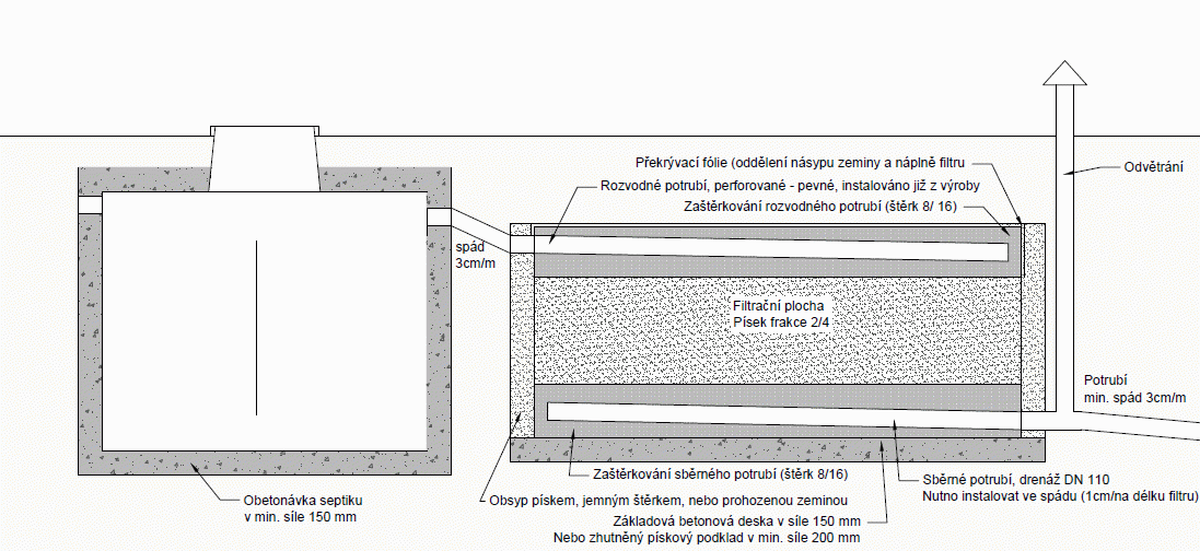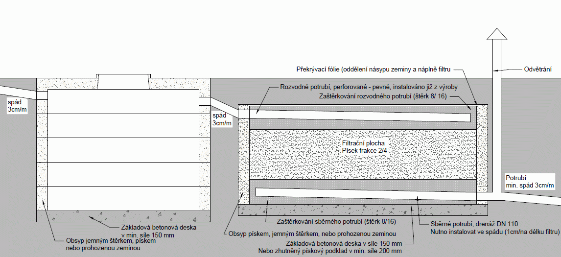 Filtry jsou konstruovány jako samonosné nádrže, které instalujeme na pískové lože a obsypáváme pouze štěrkem či zeminou.
